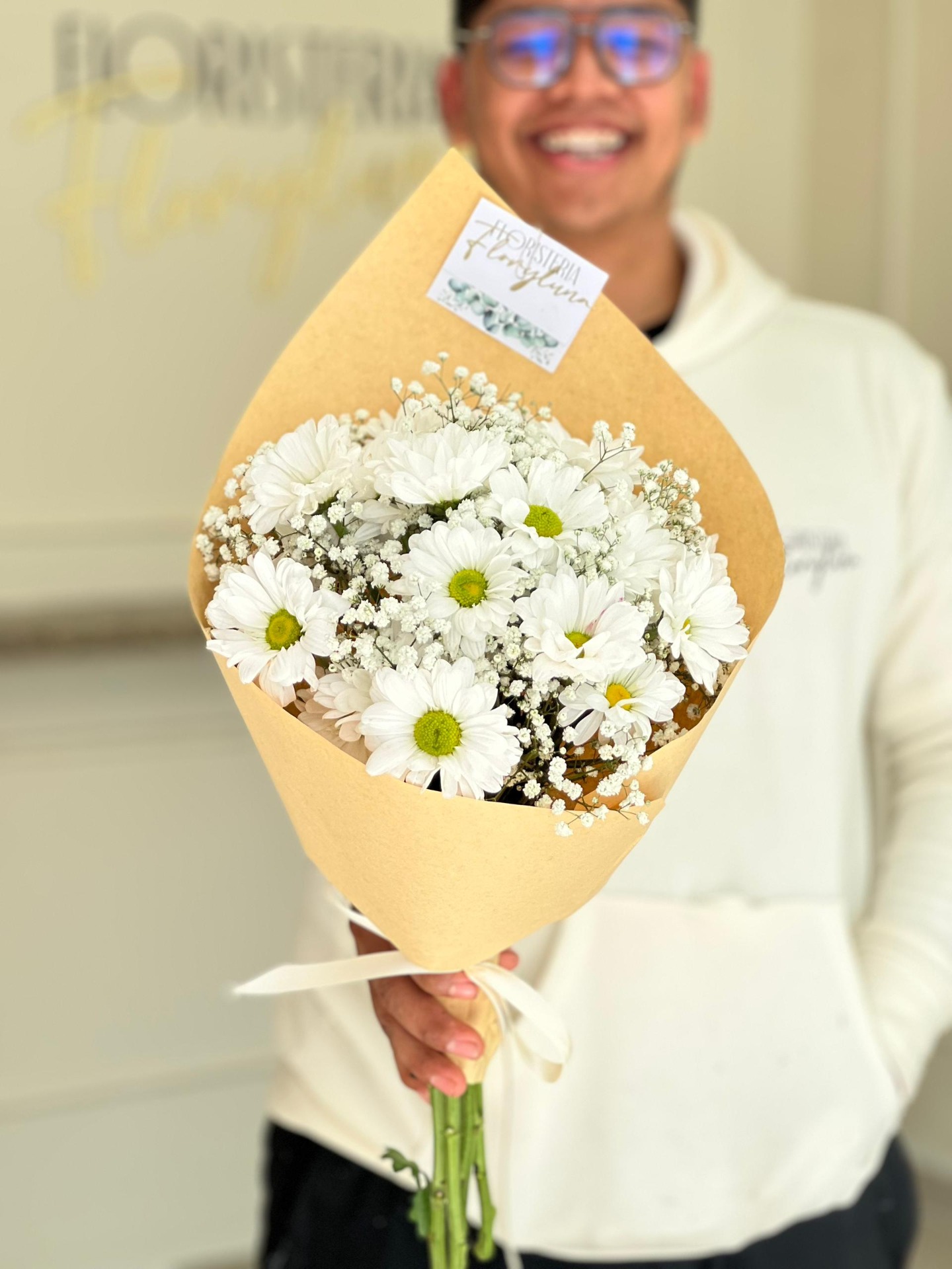 Mezcla de rosas blancas , estrellas de belen, gipsofilias, toques de eucalipto y follaje sutil.